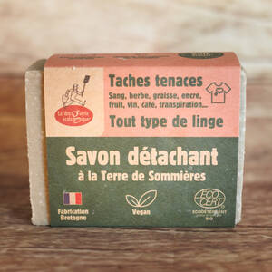 Mouiller le savon, frotter le linge sec, laisser agir 10 - 15 minutes et rincer à l'eau claire ou laver à la machine. En cas de persistance des taches, recommencer l'opération.