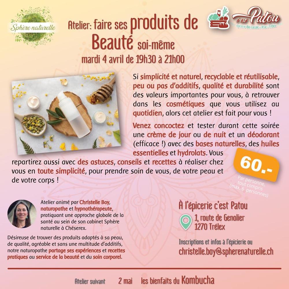 En avril, l'atelier donné par Christelle va nous chouchouter : venez apprendre à faire vos produits de beauté