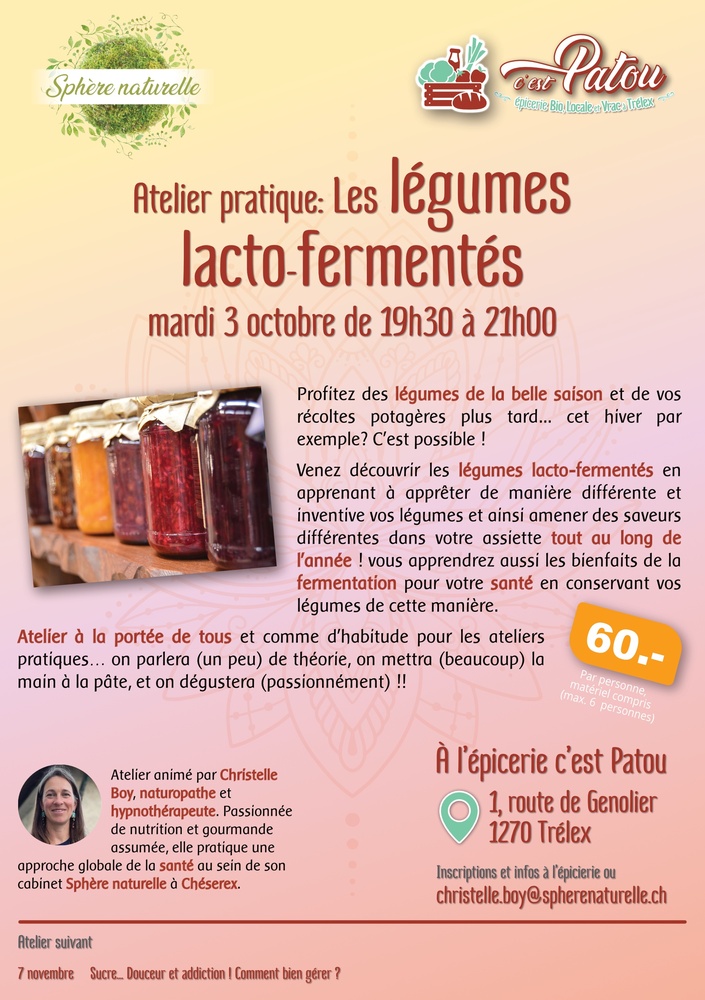 Cet atelier vous intéresse ? Vous pouvez vous inscrire avec plaisir à l'épicerie, par mail ou auprès de Christelle directement. Attention, le nombre de participants est limité à la place de notre arrière-boutique ;)