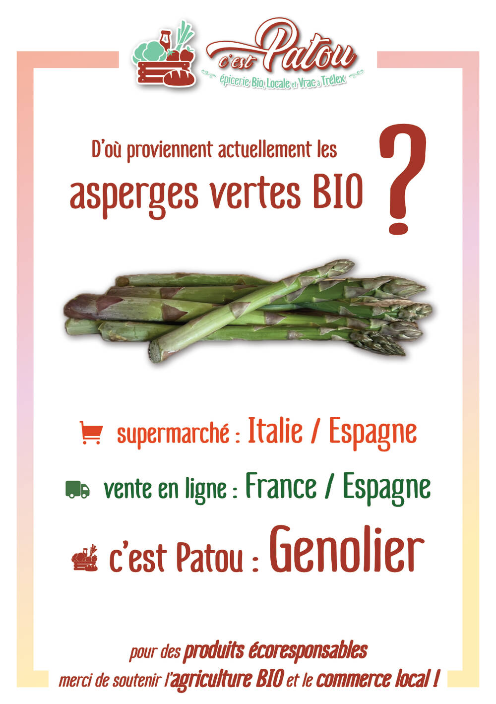 Prenons l'asperge verte, "LE" légume de printemps. Nos recherches montrent qu’actuellement, ni la grande distribution ni les grands sites de vente en ligne ne proposent d’asperges vertes BIO localement produites.